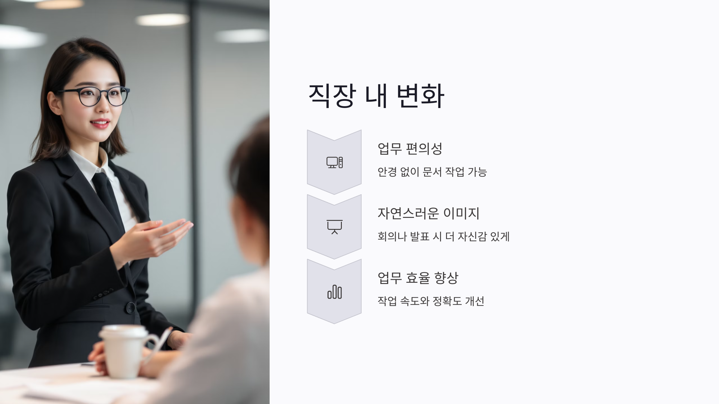 수술 후 가장 먼저 느껴지는 변화는 업무 편의성입니다. 문서 작업, 컴퓨터 사용 시 안경 없이 일할 수 있게 되어 업무 효율이 높아지고, 회의나 발표에서도 더욱 자연스러운 이미지를 연출할 수 있습니다. 주변 동료들도 외모와 업무 스타일 모두 긍정적인 변화를 체감하는 경우가 많습니다.