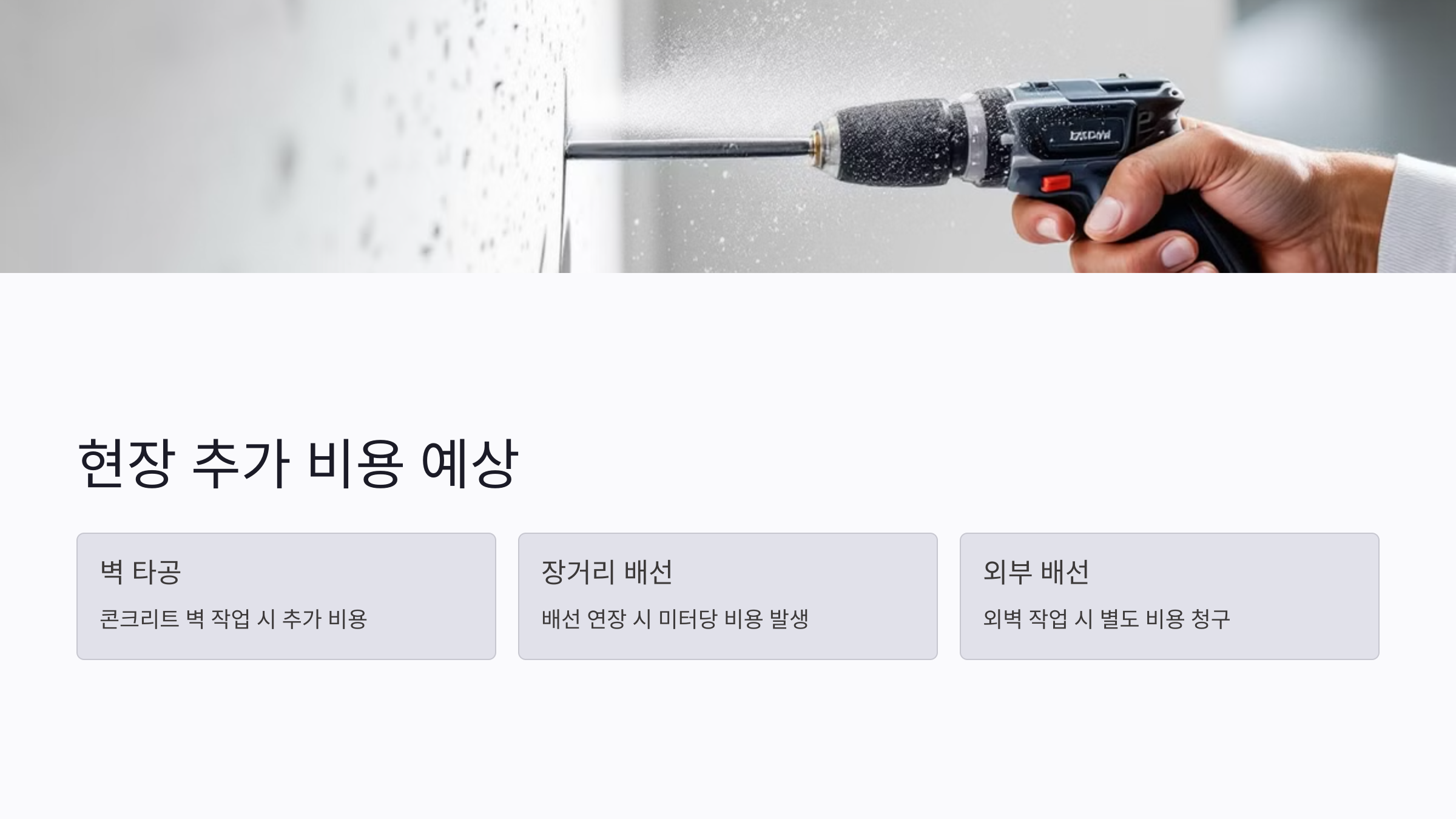 세 번째, 외부 배선 인입. 외벽을 따라 추가 배선을 설치해야 하는 경우, 고소작업이나 장비 설치 비용이 별도로 청구됩니다.