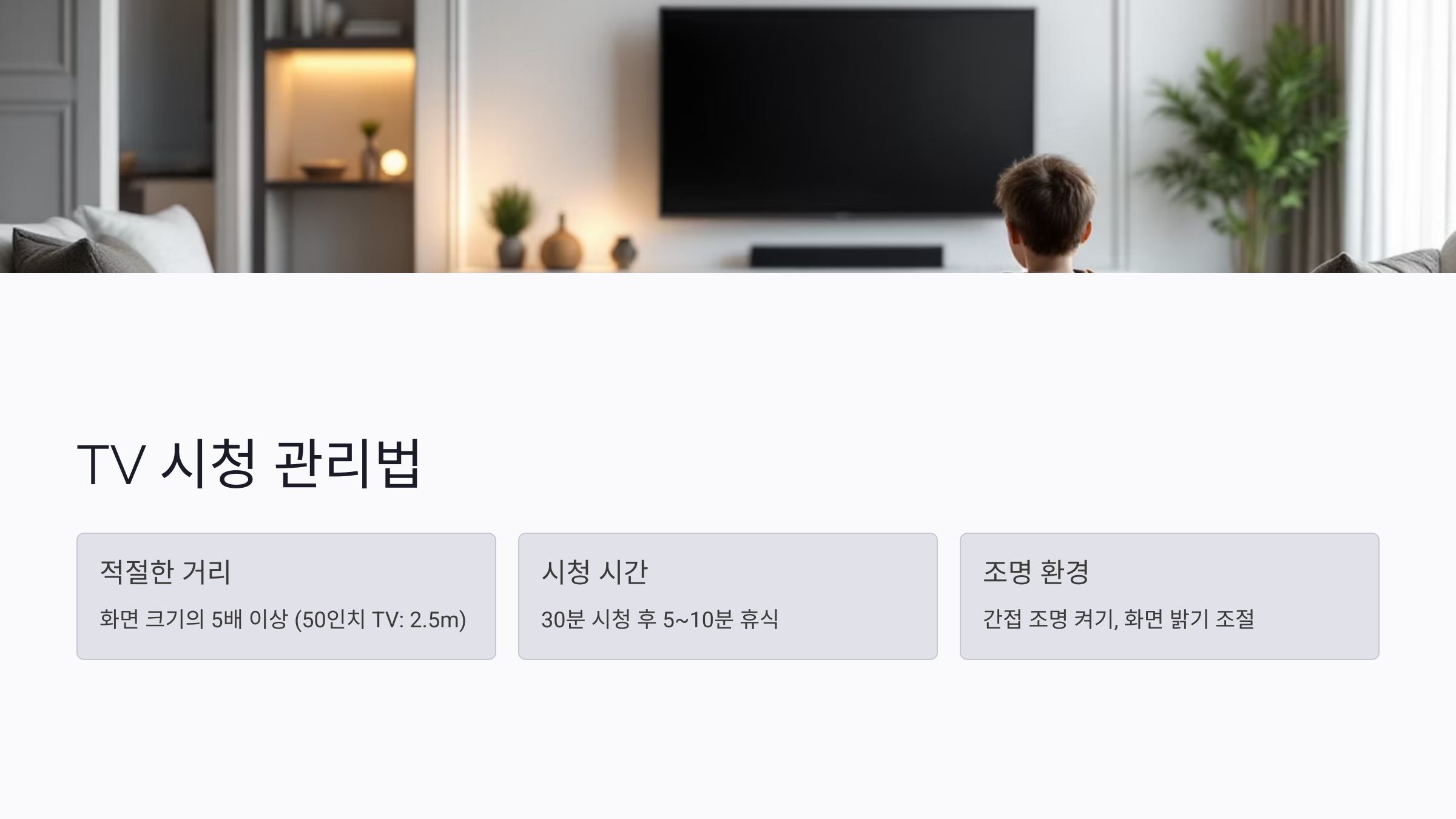 | TV 시청 습관 | 거리 미확보, 연속 시청, 야간 시청이 문제 | 30분마다 눈 휴식, 거리 확보, 조명 조절 |